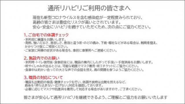 皆さまの一つひとつの行動が、通所リハビリという大切な場を守ります。