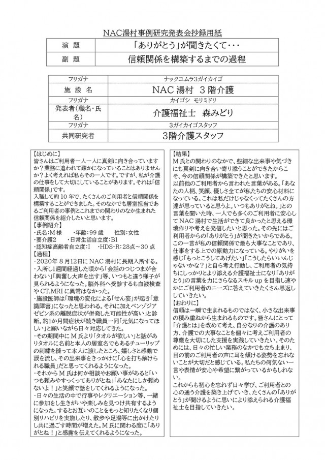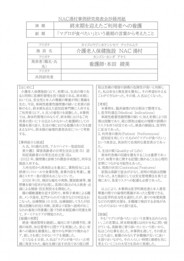 小さな寄り添いが大きな変化を生み、「関係性こそがケアの本質」であることを改めて感じさせる発表でした。