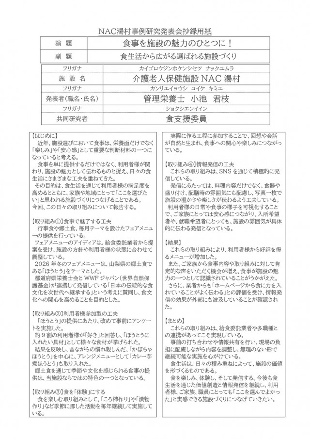 郷土食フェアや食体験、SNS発信を通じて、食事を「楽しみ」から「施設価値」へと高めた取り組み。