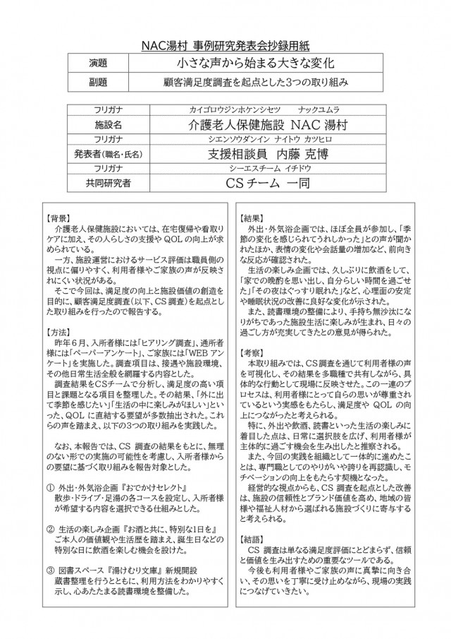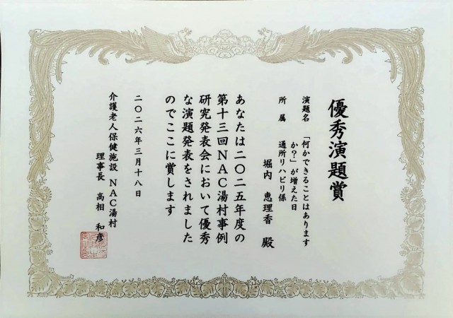 利用者主体のケアと施設価値向上を両立させた実践が印象的でした。