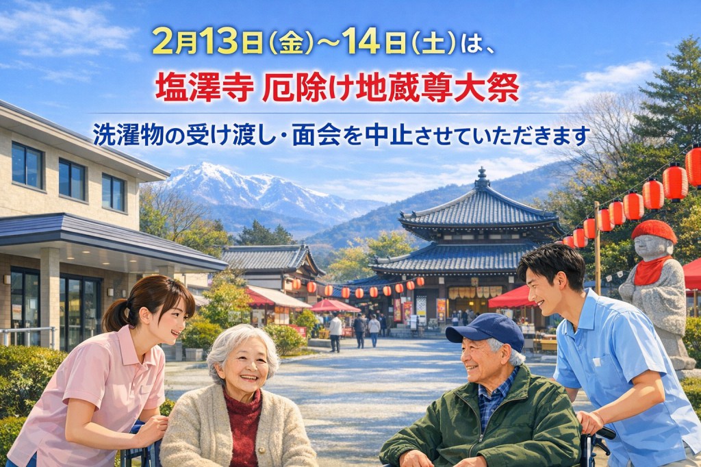 【ご注意とお願い】 2月13日(金)~14日(土)は「塩澤寺厄除け地蔵尊大祭」開催に伴い、洗濯物の受け渡しおよび面会を中止いたします 2026/01/23