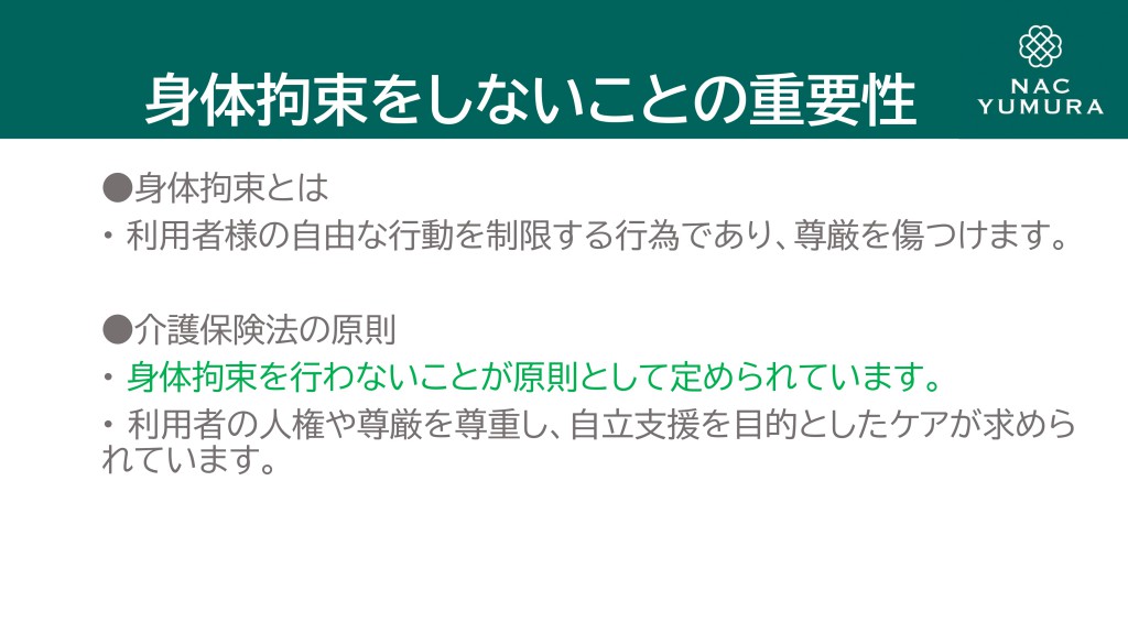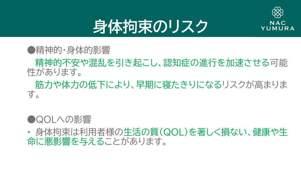 このように、制度の違いによって対応が異なりますが、NAC湯村では安全性と法令の遵守を最優先に、誠実な運営を行っております。