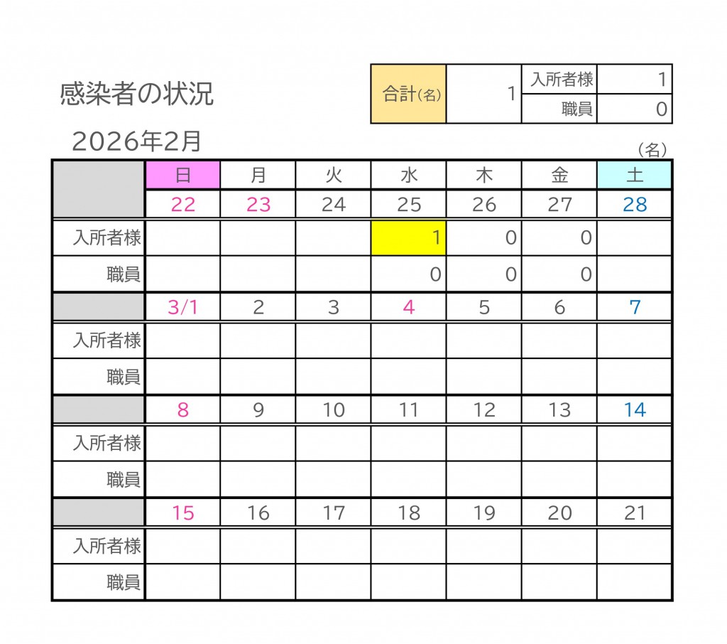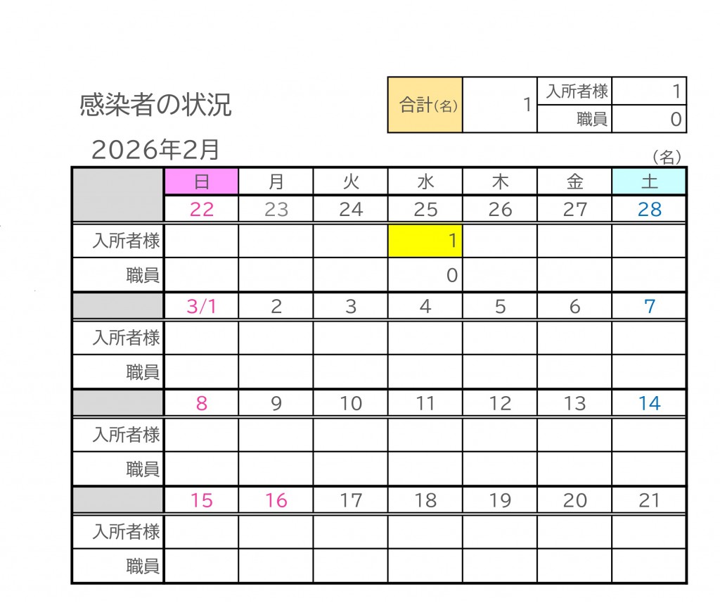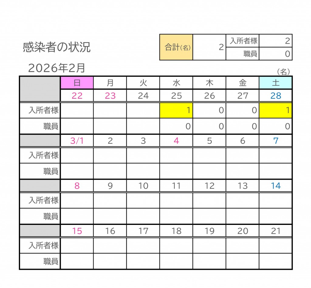 これまでに確認された感染者(入所者様)は計2名となっております。
