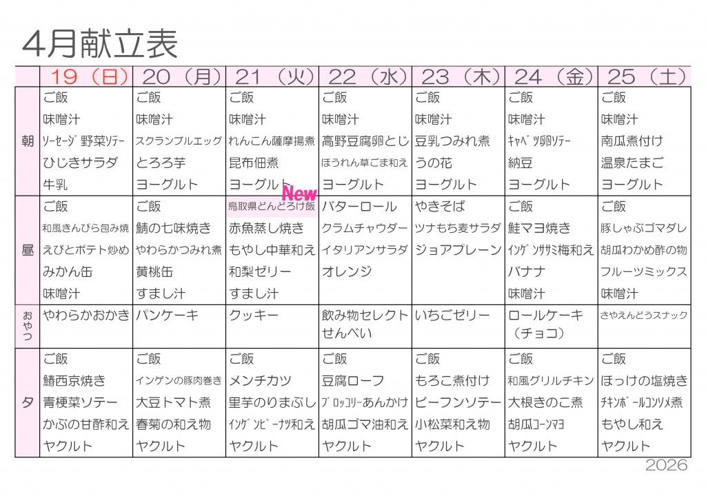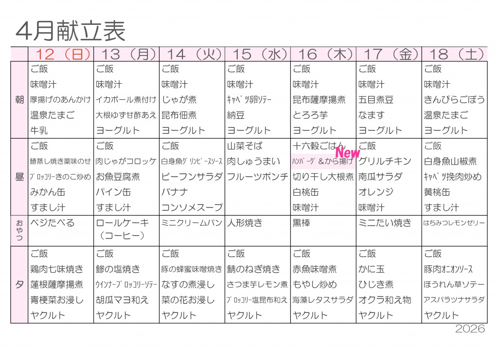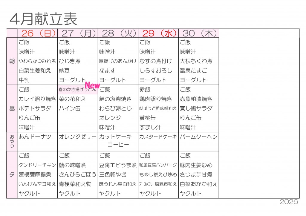 4月献立表を更新しました — 新年度スタート!春を味わうごはん —2026/03/25
