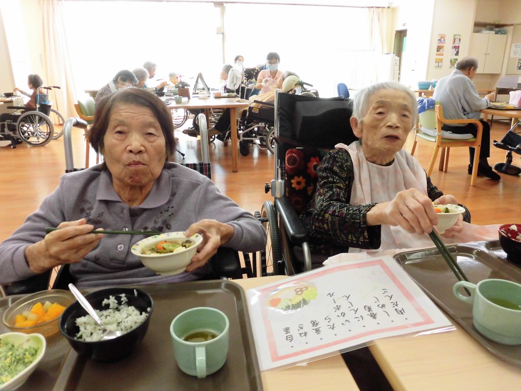 昼食にはお祝い御膳を提供しました。お赤飯と種類豊富で色とりどりのおかずに『おいしそう』『うれしいな~』と喜びあふれる笑顔でおしゃっていました。