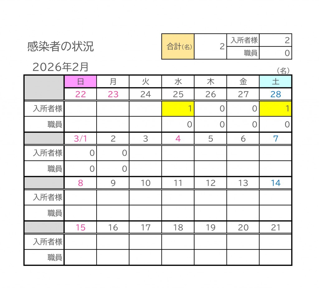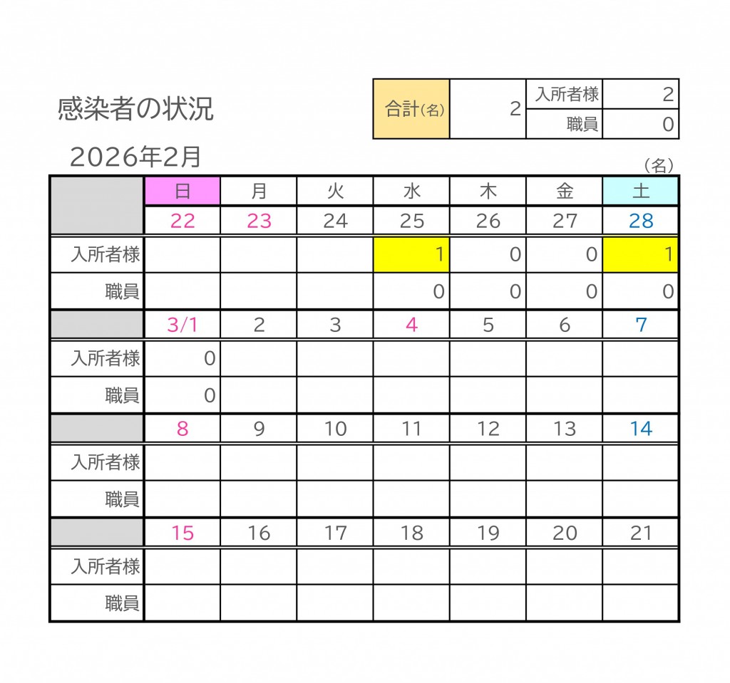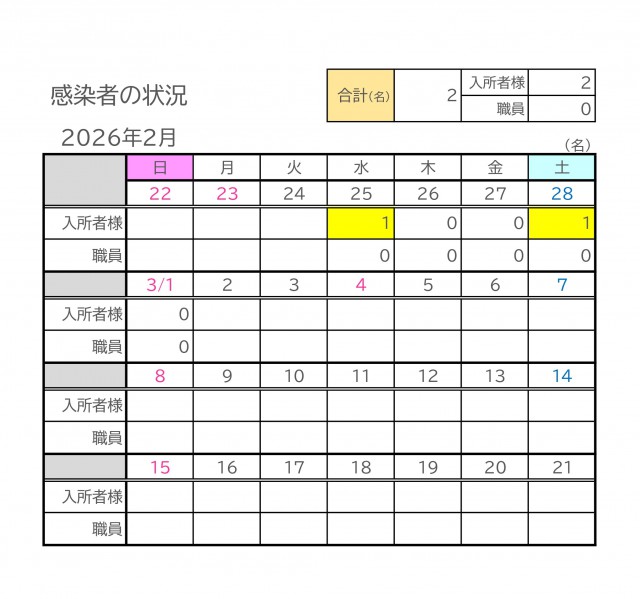 これまでに確認された感染者(入所者様)は計2名となっております。