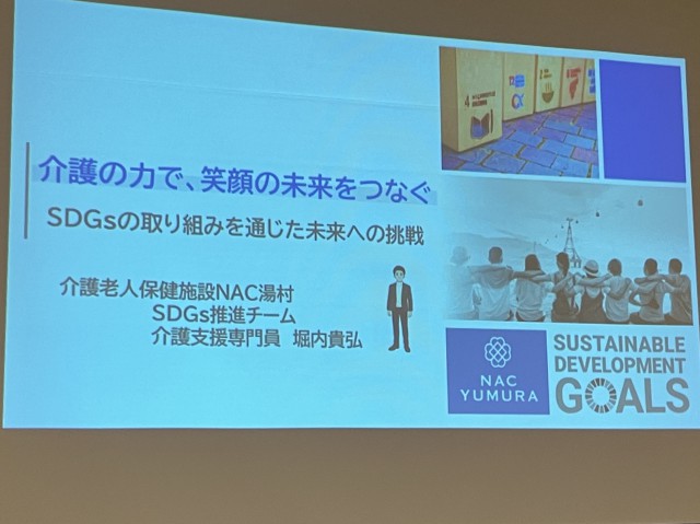 スローガン「介護の力で、笑顔の未来をつなぐ」のもと、NAC湯村が進めてきたSDGsへの実践的アプローチを紹介しました。