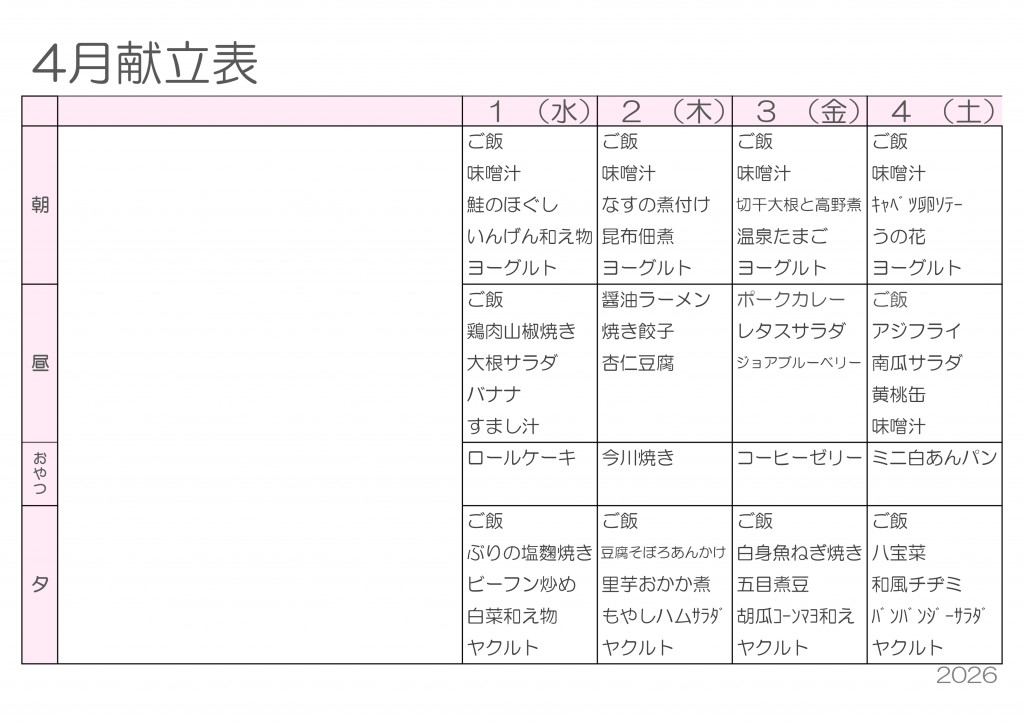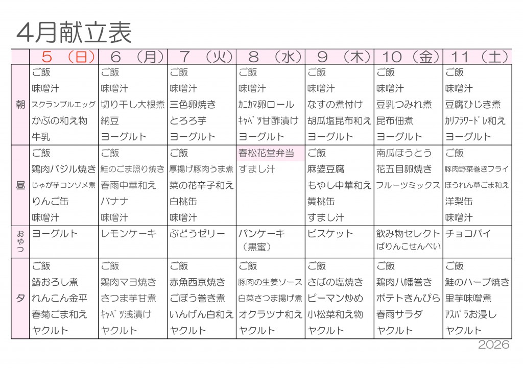 4月献立表を更新しました — 新年度スタート!春を味わうごはん —2026/03/25
